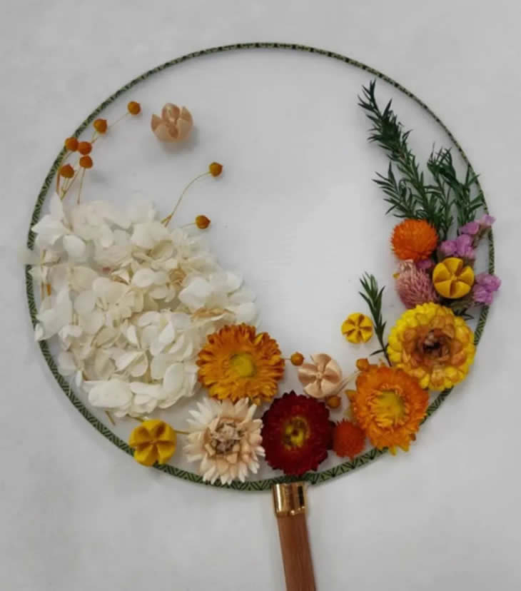 手中白团扇。净如秋团月。永生花落座于团扇,美在其形,美在其韵,希望“女神”们能与这幅团扇一样美在其心,美在其魂。